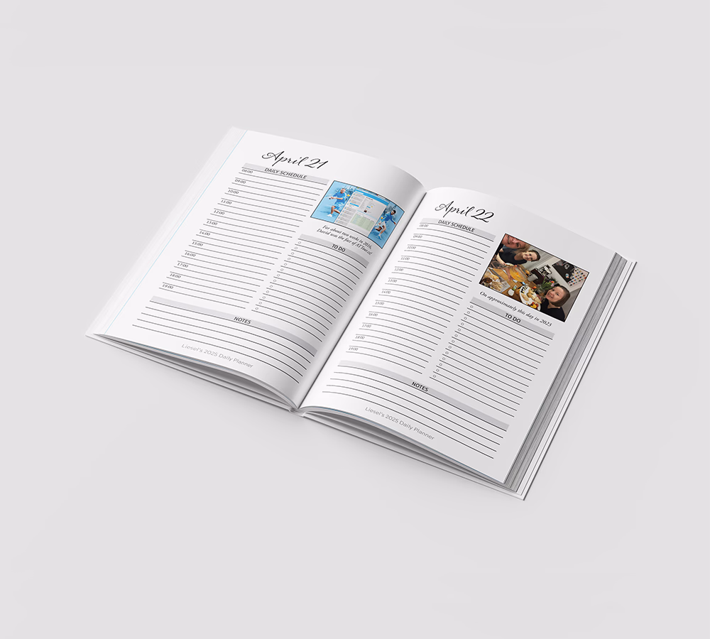 Discover what sets Lynx Book apart with personalized photos and text while selecting from a range of refined layouts, design themes, and your choice of a handmade leather or spiral-bound finish. Every feature is crafted with care to make planning more meaningful and memorable.